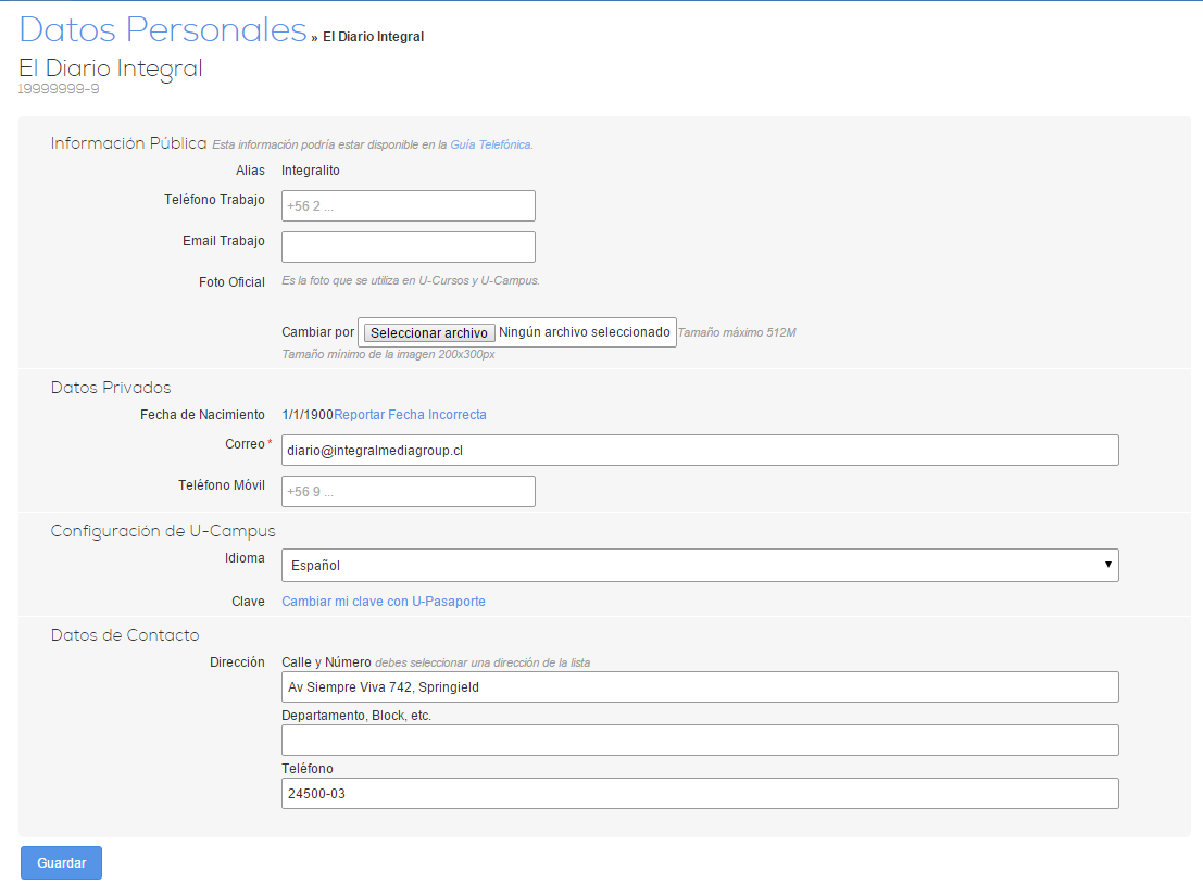 Es probable que cuando entraste a la facultad y te pidieron subir una foto para la TUI, ésta haya salido borrosa, el formato no haya sido el mejor, o que simplemente tu cara se viese completamente distinta a como es en la realidad. Si ese es tu caso ¡No te preocupes! En esta sección podrás cambiar tu foto oficial para la Universidad, además de tus datos de contacto, y hasta el idioma en el que usas U-campus. Lamentablemente hay datos como la fecha de nacimiento que no podrás cambiar, los cuales debes corregir de forma directa con el ADI utilizando un formulario específico para ello.